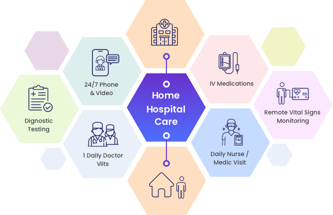 Rainbow Health assists providers, payors, and patients in building a safe and secure space for proper acute management, post-acute care management, and transitioning to home health care services. With the hospital-at-home care program, we offer:
